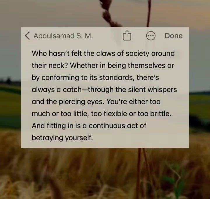 Damilare Kuku gets it right in her book: 'For the ones who stare at a mirror all day, hoping to fix it with their eyes... I have broken my mirror, please break yours.' Free yourself from the shackles of trying to fit society's mold. Don't lose yourself in the search for yourself.